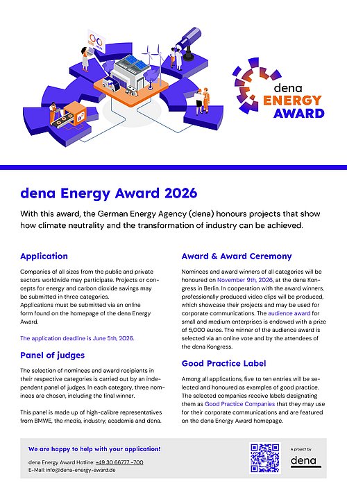 The dena Energy Award 2026 recognises companies from Germany and abroad that are using innovative projects to improve energy efficiency, reduce CO₂ emissions and drive the transition to climate neutrality. An independent jury will select the winners for outstanding solutions. In addition, the “Pioneer” People’s Choice Award will be presented to small and medium-sized enterprises. The awards ceremony will take place in Berlin in November.