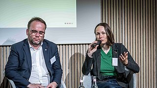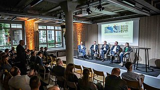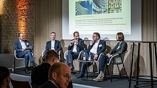 Zu Beginn der Diskussionsrunde ging Christian Stolte, Bereichsleiter Klimaneutrale Gebäude, Deutsche Energie-Agentur GmbH (dena), auf den aktuellen Diskussionsstand zum GEG, den vergangenen Prozess sowie die entsprechenden Rahmenbedingungen ein. Er betonte, wie wichtig die Schaffung von verlässlichen Leitplanken für die Zukunft sei. Anschließend moderierte er die Podiumsdiskussion mit: