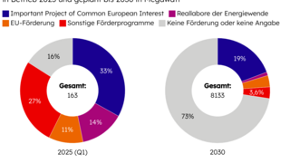 Aktuell können kaum Elektrolyseprojekte ohne öffentliche Förderung realisiert werden. Die Auswertung verdeutlicht: Mehr als 80 % der sich bereits in Betrieb befindlichen Anlagen werden über öffentliche Fördermittel unterstützt. Dazu zählen Vorhaben, die im Rahmen des “Important Project of Common European Interest (IPCEI) Wasserstoff” und der “Reallabore der Energiewende” gefördert werden. Diese machen rund 40 % der installierten Kapazität aus. Der Anteil der über die Reallabore geförderten Projekte ist 2025 noch signifikant, sinkt jedoch bis 2030 deutlich, da diese vor allem der Erprobung neuer Technologien in kleineren Projekten dienen.