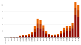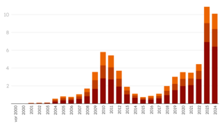 Die dena-Analyse macht zudem deutlich, dass seit Jahren die höchste Leistung in städtischen Regionen zugebaut wird. In den letzten beiden „Boom-Jahren“ 2023 und 2024 war der Ausbau in städtischen Regionen sogar stärker als im vorherigen Peak 2010 und 2011. Im Jahr 2023 sind es bereits 63 Prozent der insgesamt zugebauten Leistung bzw. 6,9 Gigawatt von insgesamt 10,8 Gigawatt und 6,4 Gigawatt von insgesamt 10,1 Gigawatt bei dem jährlichen Zubau 2024.