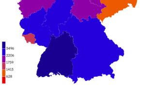Die Bundesland-Karte zur gebäudenahen Photovoltaik-Leistung pro Baufläche zeigt ein deutliches Gefälle von Nord-Ost nach Südwest – nur das Saarland bricht mit einem auffallend geringen Wert aus diesem Muster aus. Spitzenreiter ist Baden-Württemberg mit durchschnittlich 3.496 Kilowatt-Peak-Leistung (kWp) pro Quadratkilometer auf Wohn-, Misch- sowie gewerblich oder industriell genutzter Baufläche. Das ist mehr als doppelt so viel Solar-Leistung als etwa in Brandenburg, Mecklenburg-Vorpommern und Schleswig-Holstein installiert ist. Dort liegen die Werte zwischen 1400 – 1600 kWp pro Quadratkilometer bebauter Fläche liegen. Im Mittelfeld rangieren Thüringen, Sachsen-Anhalt und Niedersachsen, die jeweils etwas unter der Marke von 2000 kWp pro baulich geprägter Fläche liegen. Nordrhein-Westfalen liegt etwas darüber. Schlusslichter beim Vergleich der PV-Leistung pro Baufläche sind Sachsen sowie die Stadtstaaten Berlin, Bremen und Hamburg.
