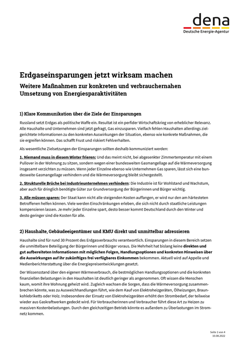 Das Gas ist knapp und der Winter bald da - Szenarien der Bundesnetzagentur oder ENTSO-G belegen, dass die jetzt einzusparenden Gasmengen nach wie vor gewaltig sind, um bei weiteren Verzögerungen russischer Gaslieferungen ohne größere Einschränkungen über den Winter zu kommen. Aus einer Debatte mit vielen Ideen und Vorschlägen muss konkretes Handeln für echte Erdgas-Einspareffekte werden. Die Deutsche Energie-Agentur (dena) hat dazu einen Maßnahmenkatalog mit Empfehlungen zur konkreten und bürgernahen Kommunikation sowie Umsetzung von Energiesparaktivitäten veröffentlicht. Das Ziel: Mehr Wirksamkeit durch Bürgernähe, Transparenz und Kooperation zwischen den verschiedenen Ebenen.