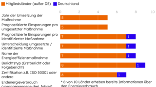 Die dena arbeitet gemeinsam mit zehn europäischen Energieagenturen an dem Projekt LEAPto11. Ziel des Projekts ist die Unterstützung bei der nationalen Umsetzung der Energieeffizienzrichtlinie. Die dena hat einen Vorschlag für einen EU-weiten Basisdatensatz für bessere Energieaudits und Energiemanagementsysteme in den europäischen Mitgliedsstaaten erarbeitet. Eine Analyse der dena ergab, dass das Erfassen, Verarbeiten und Auswerten notwendiger Daten in den zehn untersuchten Mitgliedstaaten der EU unterschiedlich erfolgt. Das erschwert das Bewerten der tatsächlichen Wirkung der Verpflichtungen zu Audits und Energiemanagementsystemen.