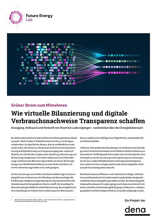 Der Energiedatenraum dient als technologische Grundlage für den sicheren und interoperablen Datenaustausch zwischen Akteuren der Energiewirtschaft und der Elektromobilität. In Release 3 wird gezeigt, wie Messwerte aus Ladevorgängen, virtuelle Bilanzierung und Grünstromnachweise zusammenwirken. Das Factsheet ist Teil einer vierteiligen Reihe, die die schrittweise Weiterentwicklung des Energiedatenraums dokumentiert und in Release 4 um die Kommunikation variabler Netzentgelte für steuerbare Verbrauchseinrichtungen ergänzt wird.