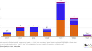 Im vergangenen Jahr wurden insgesamt 47 öffentlich bekannte langfristige PPAs (d.h. Verträge mit einer Laufzeit von mehr als fünf Jahren) abgeschlossen – drei mehr als 2023. Gleichzeitig sank die durchschnittlich vertraglich gesicherte Kapazität pro Abschluss deutlich. In Summe fiel das Gesamtvolumen der PPAs von 3,8 GW im Jahr 2023 auf 2,1 GW im Jahr 2024.