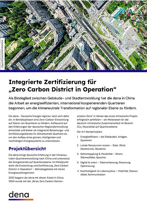 Die dena unterstützt die Energiewende auf Quartiersebene in China, indem sie deutsche Erfahrungen in der klimaneutralen Quartierentwicklung weitergibt. Das Factsheet beschreibt die Entwicklung und Zertifizierung als „Zero Carbon District in Operation“, die dabei im Mittelpunkt steht. Es handelt sich dabei um Betriebsgebiete mit klaren Energiesystemgrenzen.
