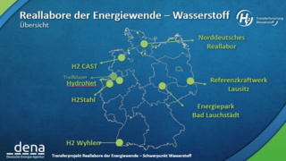 Die Wasserstoff-Reallabore der Energiewende verbinden angewandte Forschung mit der Entwicklung marktfähiger Wasserstofftechnologien. Unter realen Bedingungen und im industriellen Maßstab erproben sie innovative Lösungen, die einen wichtigen Beitrag zur Klimaneutralität leisten. Die dabei gewonnenen Erkenntnisse decken die gesamte Wertschöpfungskette für Wasserstoff ab. Die Aufgabe der dena besteht darin, zentrale Akteure aus Forschung und Wirtschaft zu vernetzen. Zudem bereitet die dena die Ergebnisse aus den Reallaboren auf, wertet sie aus und stellt sie der Fachöffentlichkeit zur Verfügung. Die Reallabore der Energiewende sind eine zentrale Säule des 7. Energieforschungsprogramms des Bundesministeriums für Wirtschaft und Klimaschutz (BMWK).